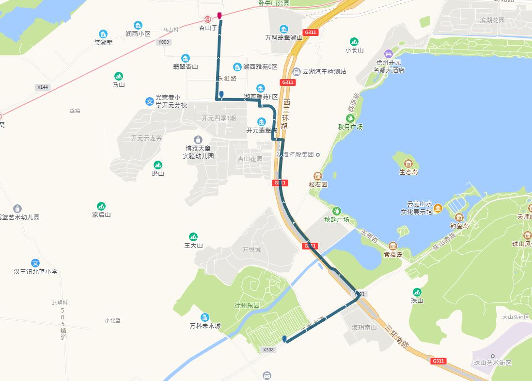 線路站點(diǎn):御景灣公交首末站、濱湖御景灣南門、姚莊街坊中心、欣欣路口、七里溝地鐵站、礦大北門、大學(xué)城、天成花園、三十四中、三十中附小、泉泰嘉苑、泉山美墅西門(路西,單向)、碧水灣小區(qū)(路北、單向)、泉山法院(路南,單向)。備注:因目前雙山路與三環(huán)南路交叉口正在施工,公交車輛無法通行,319路暫時(shí)僅運(yùn)行至泉泰嘉苑。待道路貫通后,進(jìn)行全線路運(yùn)營。
