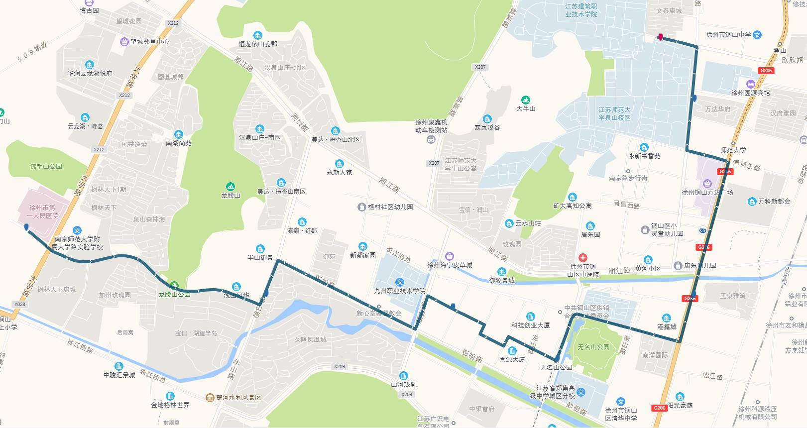 線路站點(diǎn):建筑學(xué)院、江蘇師范大學(xué)、師范大學(xué)地鐵站、萬科新都會(huì)、港鑫城、南洋國際、康樂園南門、無名山公園地鐵站、銅山區(qū)政府、楚河金茂府、嵩山路、銅山新區(qū)總站、久隆鳳凰城北門、保利迎賓館、龍腰山公園、泉山森林海、第一人民醫(yī)院南門。