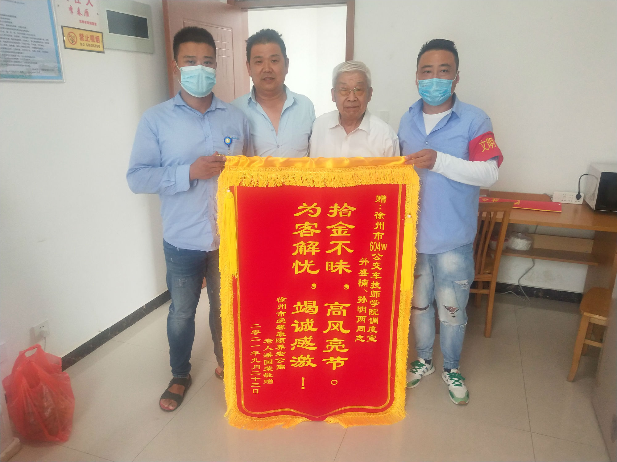 近日,一位老先生在家人的攙扶下,來到了城北公司604路技師學(xué)院調(diào)度室,將一面印有“拾金不昧,高風(fēng)亮節(jié),為客解憂,竭誠感謝”字樣的錦旗送到604路駕駛員孫明和調(diào)度員盛楠手中。